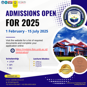 The Master’s Program in English Language Education (MPBIng) welcomes highly motivated graduates to join a program that develops competent educators, researchers, and professionals with strong global competitiveness. Admission is carried out transparently and fairly, based on Rector’s Regulation of Universitas Bengkulu No. 10/2024, through several pathways.